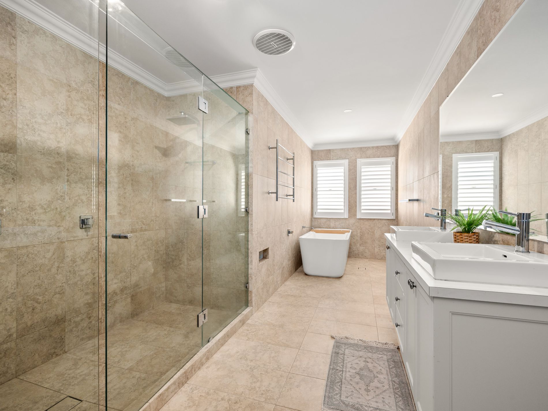• Luxe family bathroom with double shower, separate bath, and double vanity, plus a second separate toilet