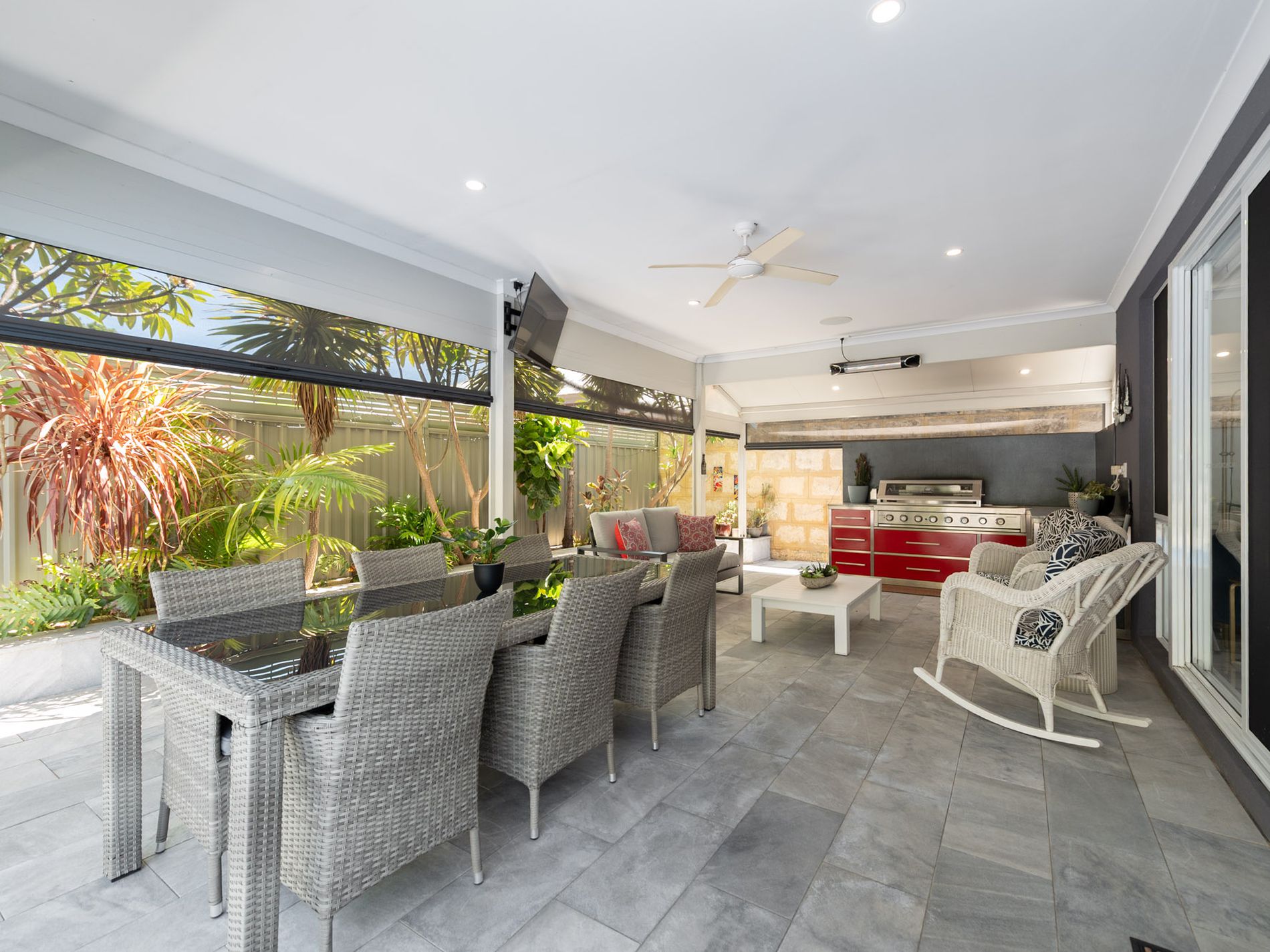 Designed for year-round entertaining, the outdoor zone is simply outstanding. Enjoy the below-ground saltwater swimming pool framed by Fremantle stone pavers, while the fully equipped alfresco includes heaters, ceiling fan, TV, built-in BBQ, a double door fridge and stone benchtops.