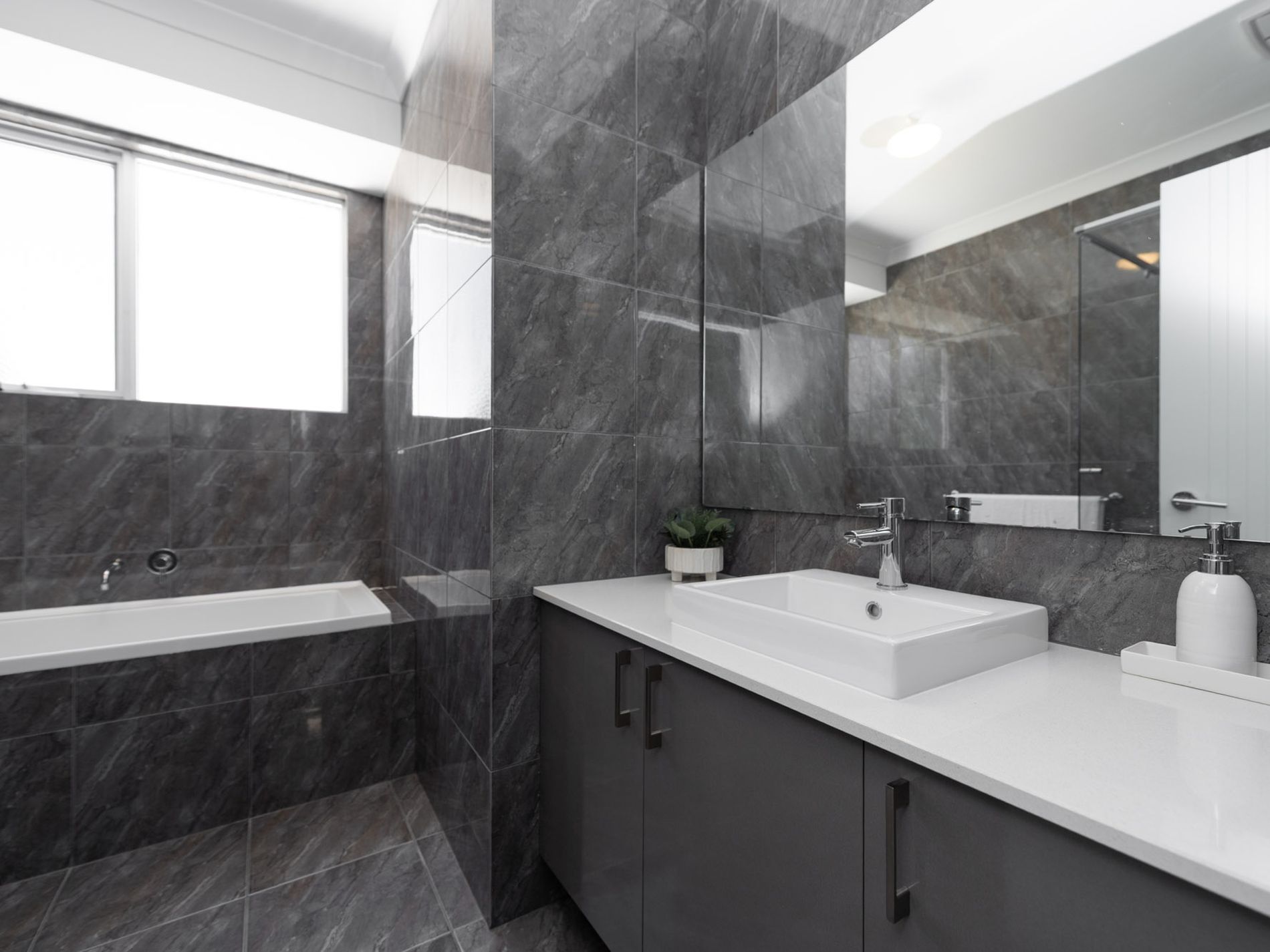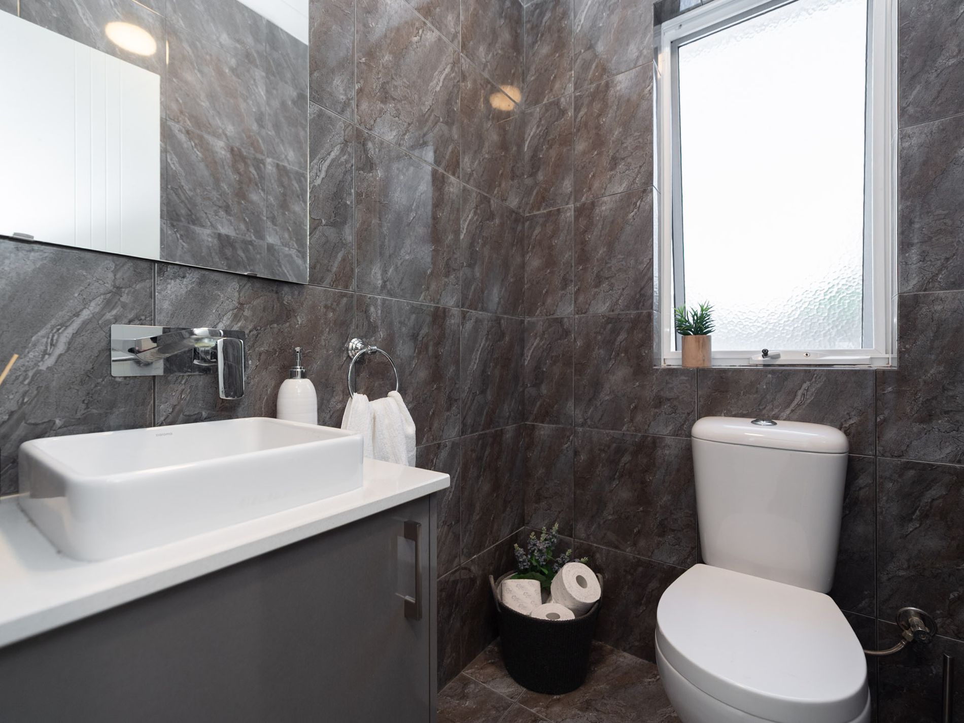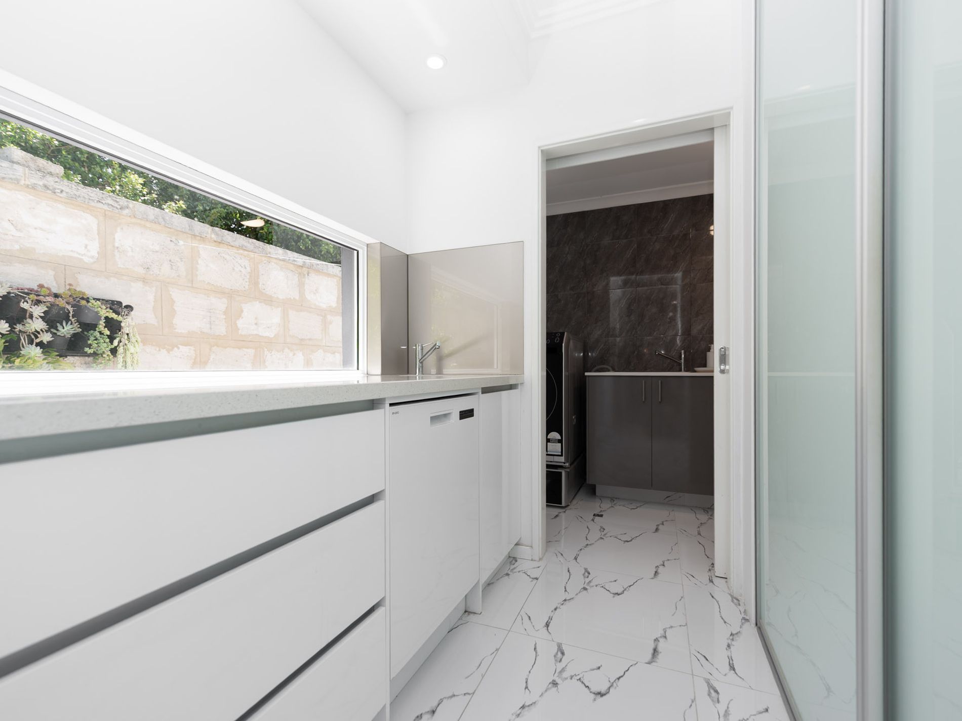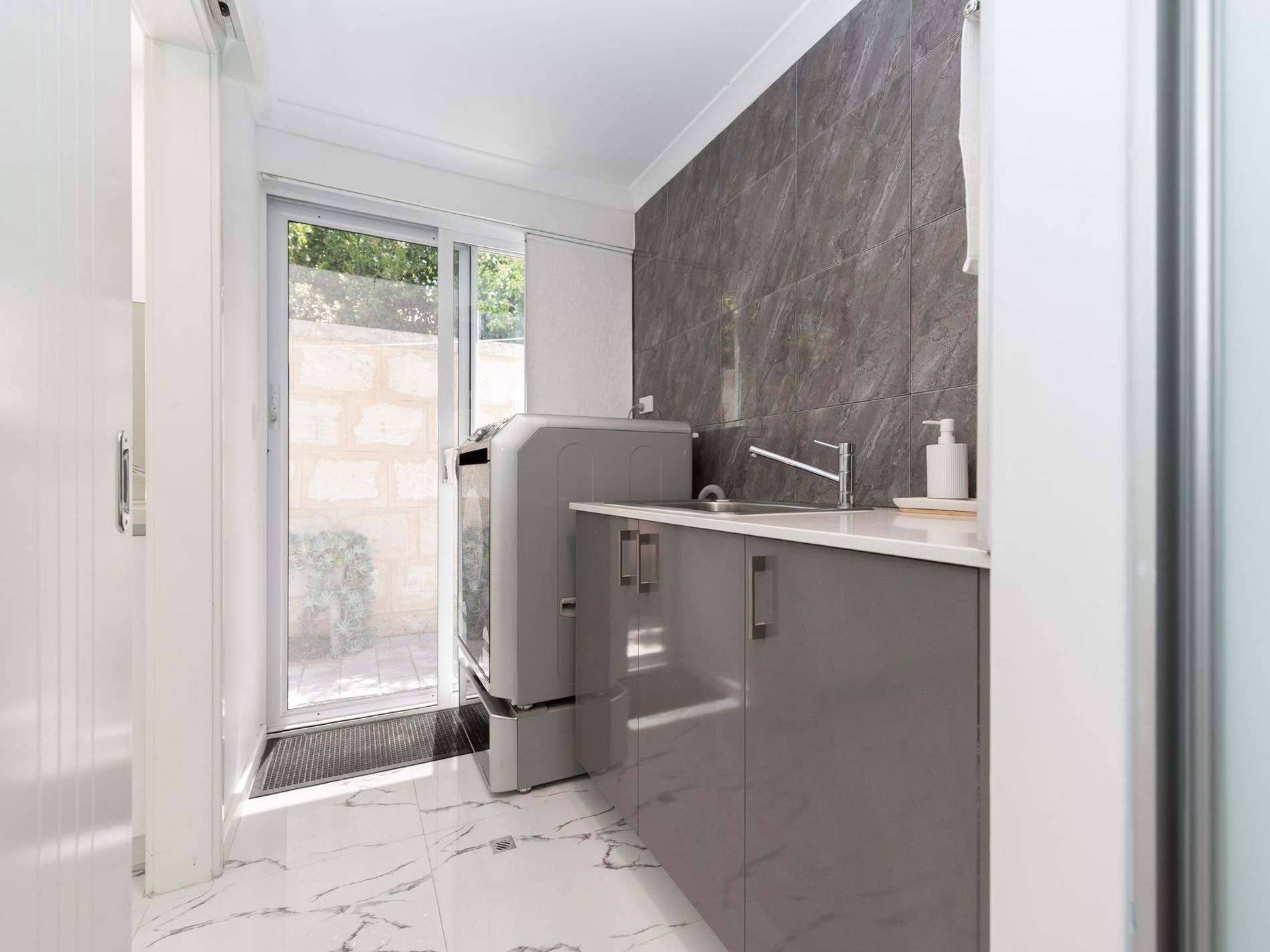 • Large laundry with full-height tiling, stone bench and extensive storage