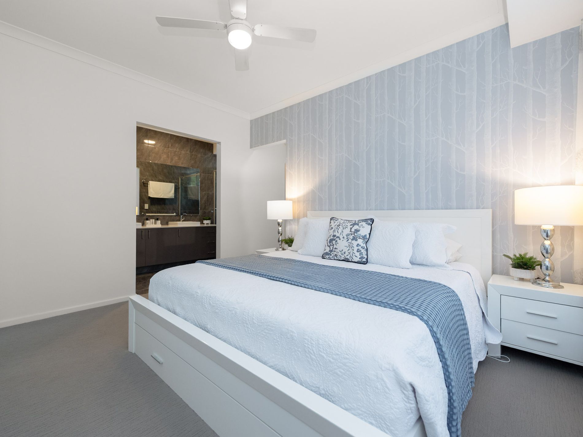 The luxurious master bedroom is a true sanctuary, complete with ceiling fan, sash windows, blinds and sheers, and a fitted walk-in robe. The hotel-style ensuite boasts full-height tiling, rain and standard shower, stone his and hers vanities, frameless mirrors and a separate WC.